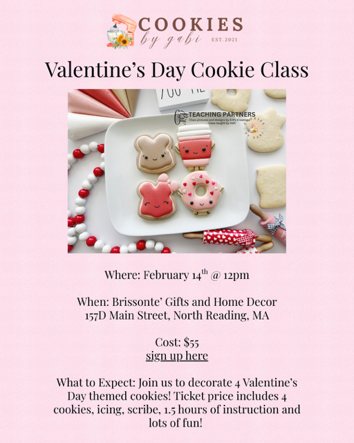 Learn to decorate Valentine's themed cookies for your loved ones at our Valentine's Day Cookie Class - no experience required!