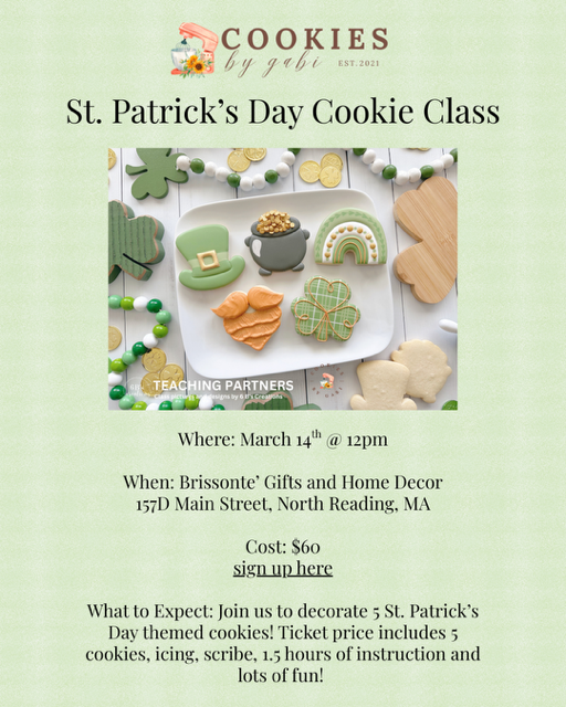Join us to decorate 5 St. Patrick themed cookies! Ticket price includes 5 cookies, icing, scribe, 1.5 hours of instruction and lots of fun!