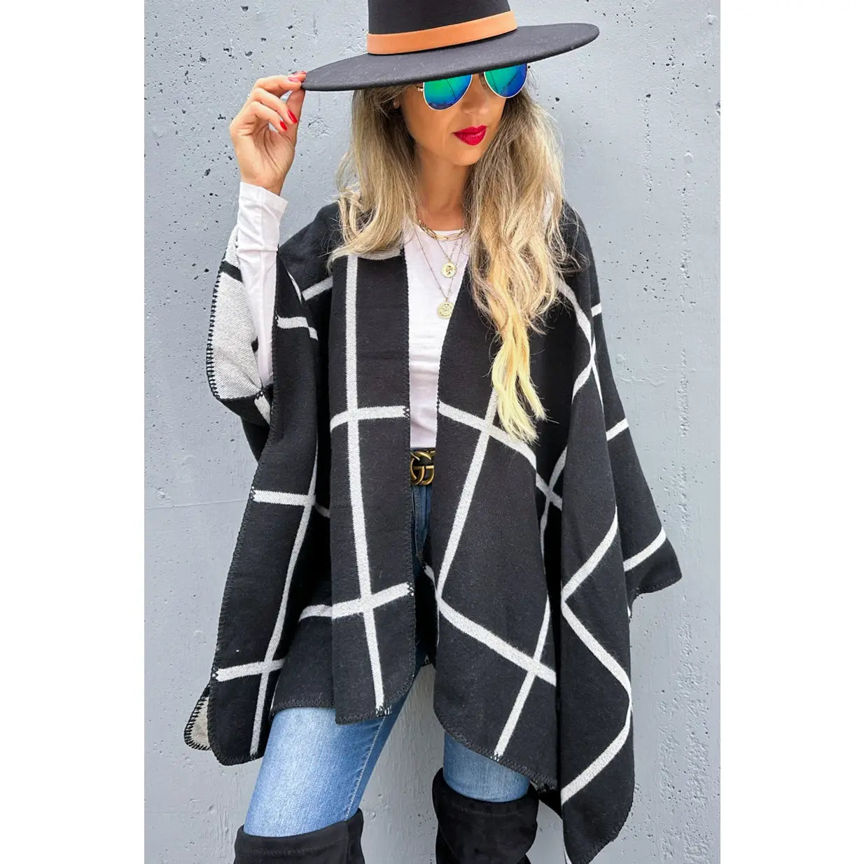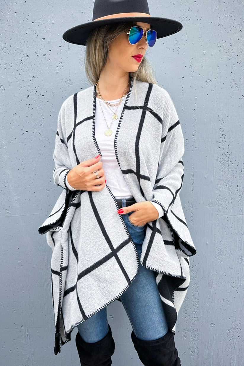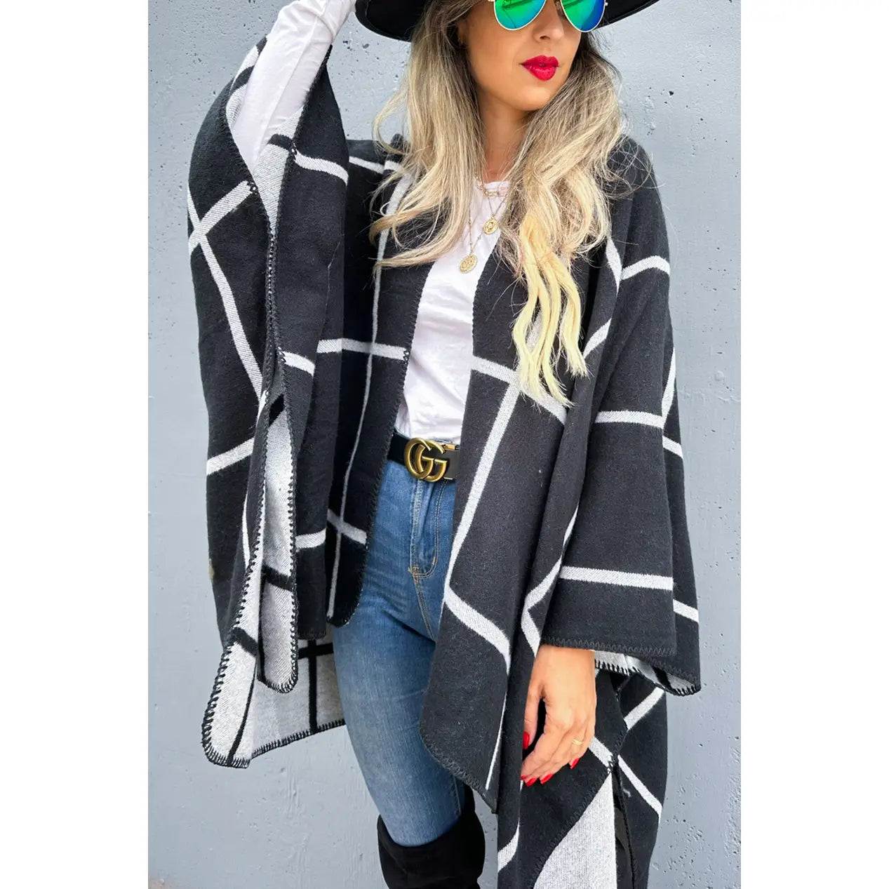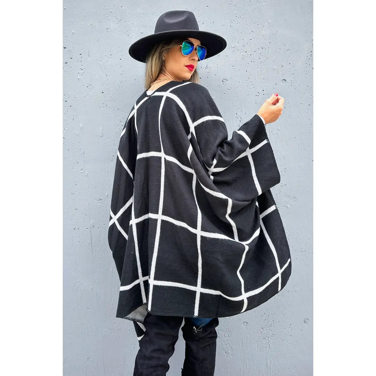 Cozy Reversible Ruana - Black Grey Dual-Tone Check Printed