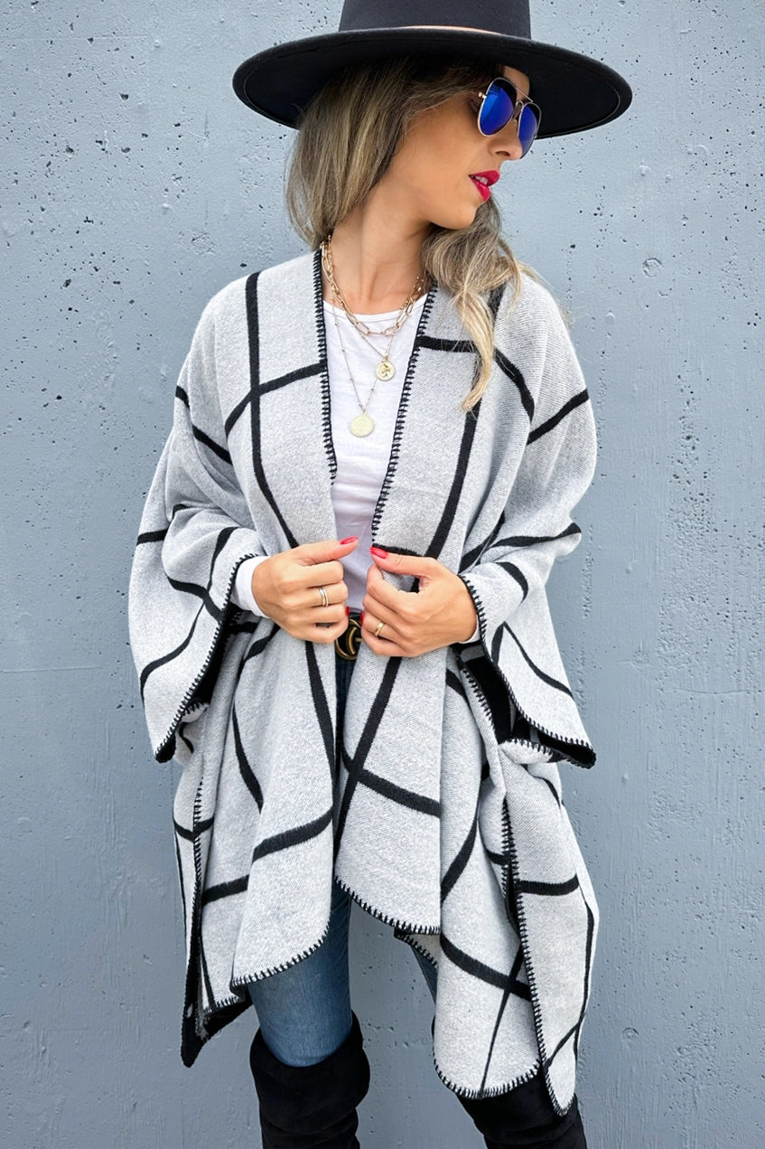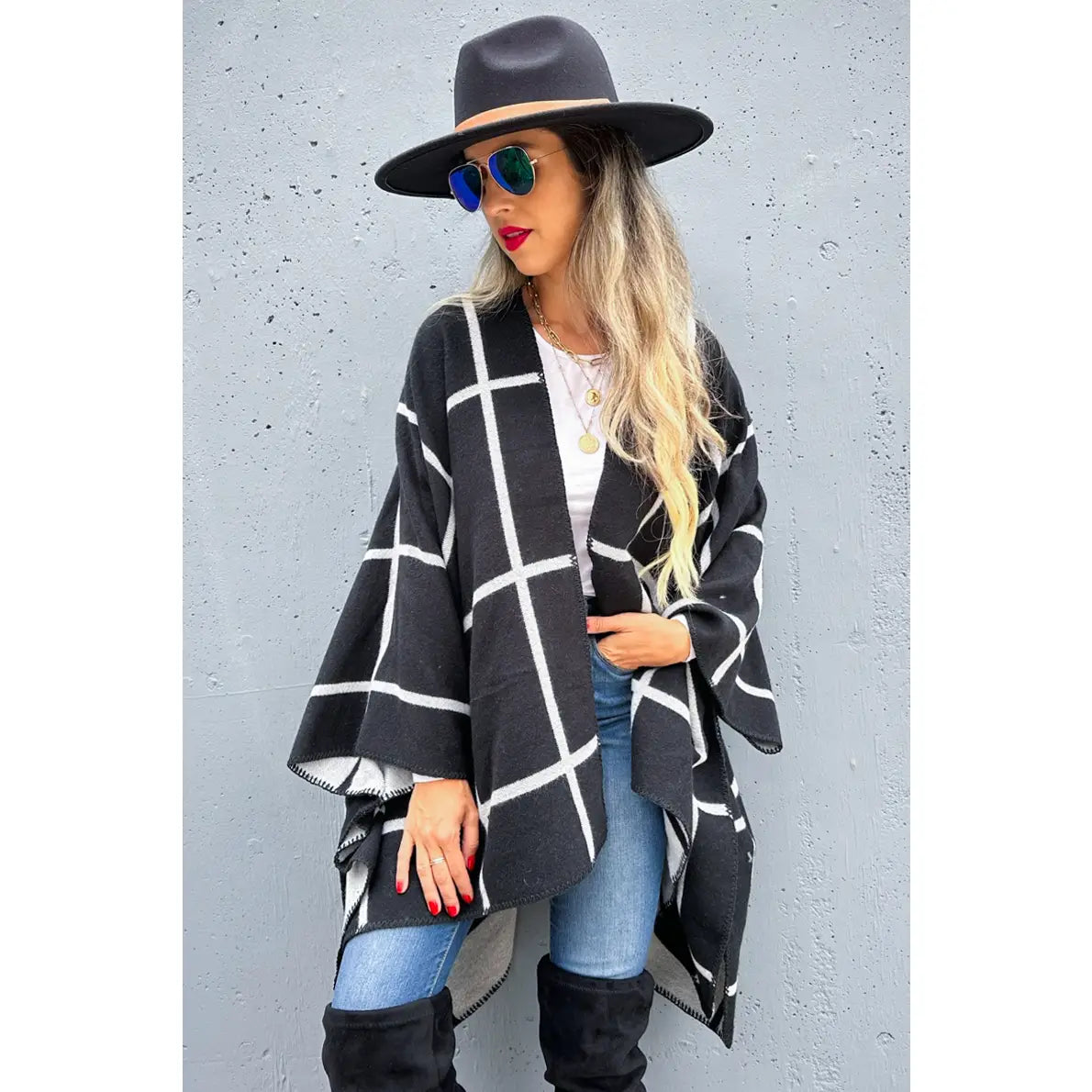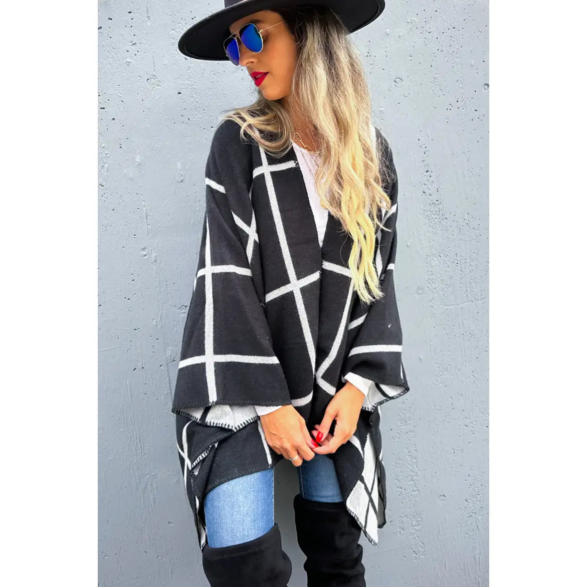 Cozy Reversible Ruana - Black Grey Dual-Tone Check Printed