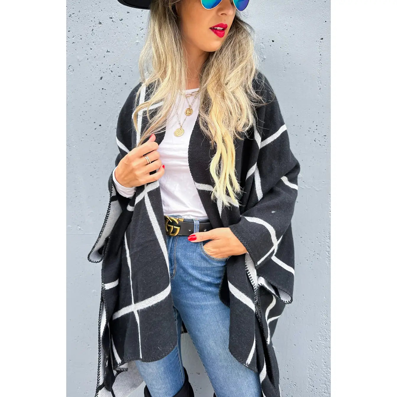 Introducing our Dual-Tone Check Printed Reversible Ruana Cardigan, the perfect blend of function and fashion. This versatile piece features a chic check pattern in two color schemes: a classic black and a soft light gray. The reversible design allows you to switch between colors with ease, adapting to different styles and occasions. Enhanced with meticulous stitch edge details, this cardigan combines comfort with elegance, making it an essential addition to any wardrobe.