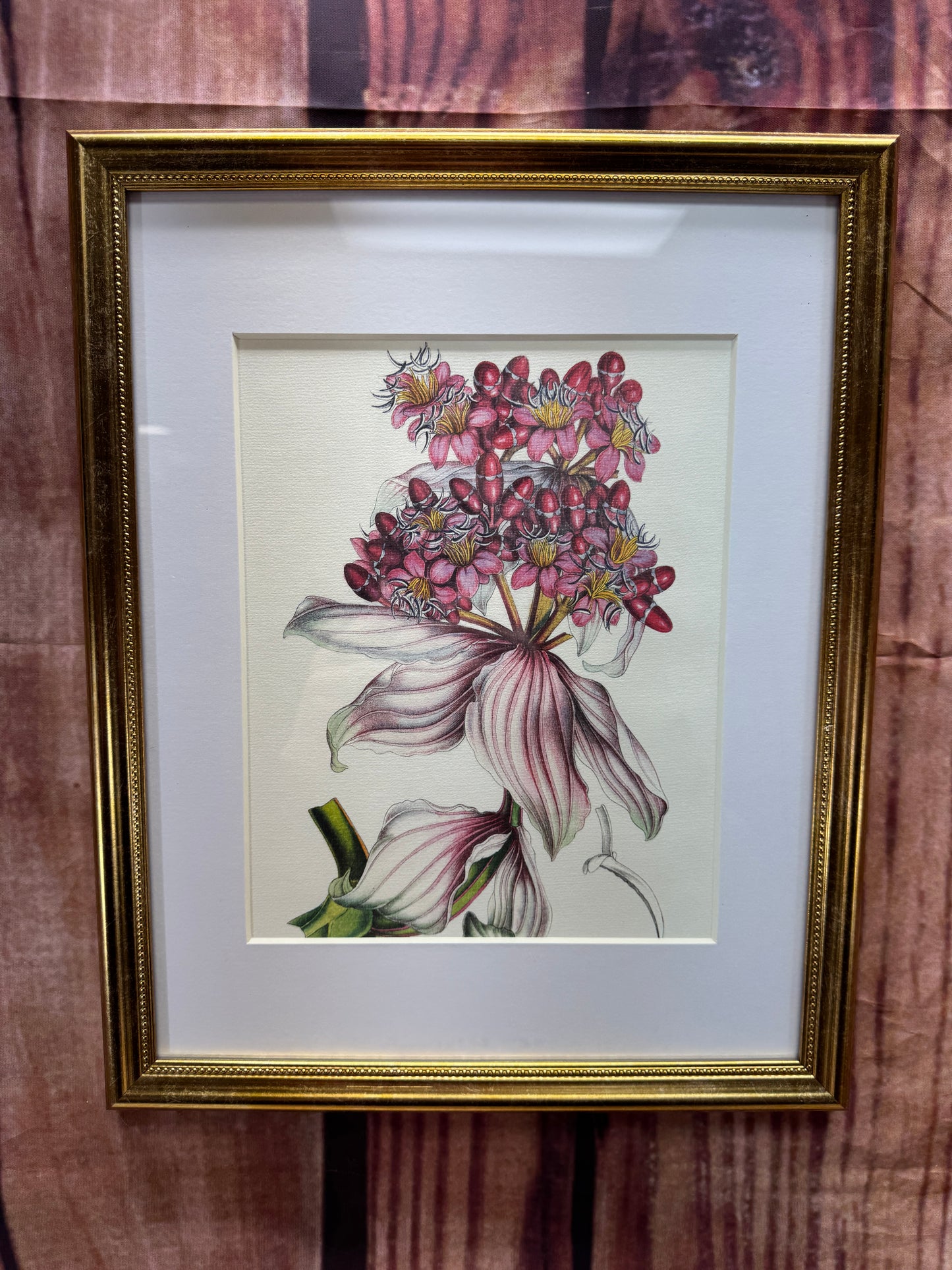 Vertical or horizontal orientation, 11x14 frame matted to 8x10, gold tone beaded trim