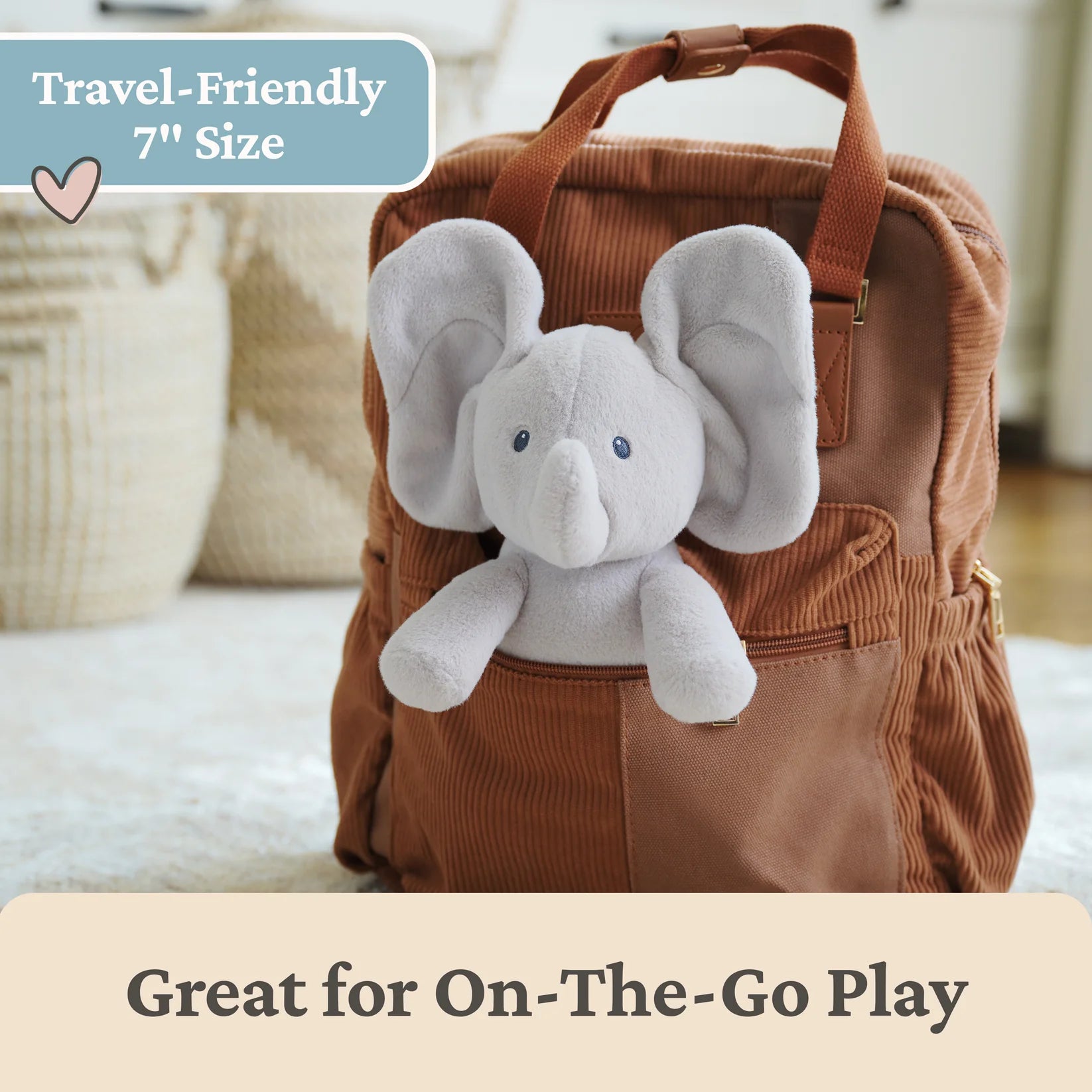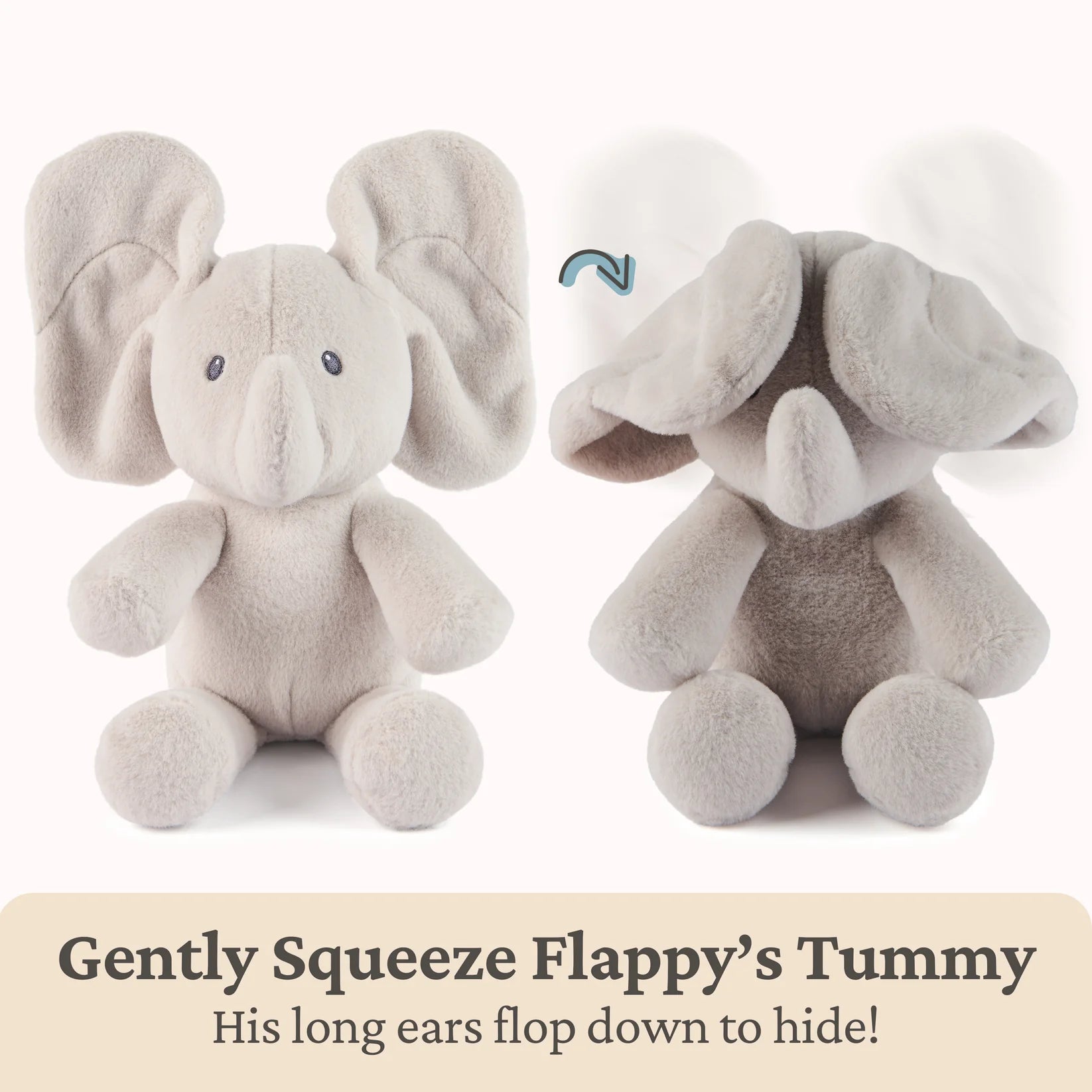 Flappy is here in an all-new format! This classic award-winning plush elephant is here in a smaller, travel-friendly size with a simpler squeeze-and-play feature that everyone can use to play peek-a-boo with baby. Simply press his tummy with a gentle squeeze and his ears flop downward, covering his eyes to hide and leaving you in control of the game. His oversized ears then pop back up as soon as you release the pressure, letting you decide when the surprise occurs. Flappy’s new 7” size and floppy limbs enable him to sit upright for display or let his legs dangle down playfully, making an adorable baby shower gift and cuddly soft toy. This innovative baby toy was also made thoughtfully, with the whole family in mind: with only minimal pressure needed to press his tummy, everyone can play comfortably and easily, from siblings all the way to grandma! Customize every peek-a-boo session to your little one’s preferences and speed, using Flappy to bond in a whole new way!