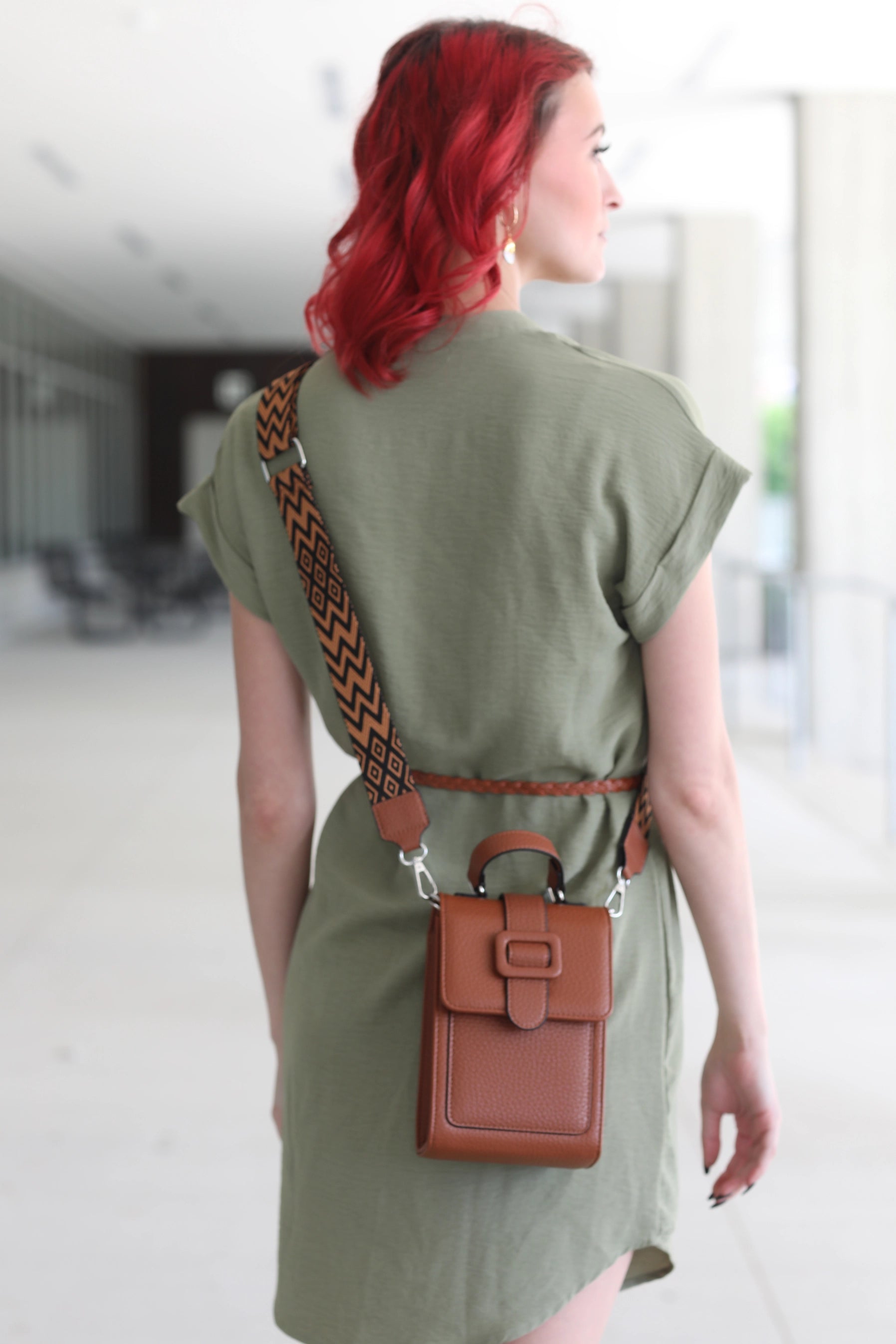 Introducing our newest crossbody, she’s large enough to fit all you need but still small and compact. With a 2 inch depth, there is room inside. Wear as a satchel or attach the coordinating guitar strap for a fun, hands-free look. On the outside back, an open pocket for phone convenience. Closes with a magnet snap, on the front you will find an open pocket. Inside is a zipper pocket and 3 RFID protected card sleeves built in.