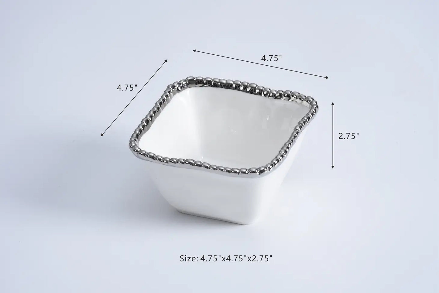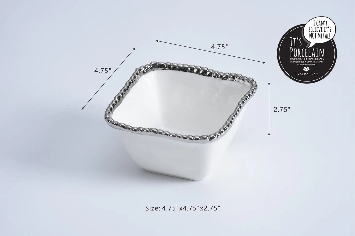 Square snack bowl in Salerno. Great for individual snacking, dips or for toppings for a make your own taco, sundae or pizza night! A perfect addition to any bar for lemons and limes. Gleaming white porcelain with lustrous silver beads in titanium. Food safe, tarnish free, dishwasher safe, oven safe to 550°. Easy Care.